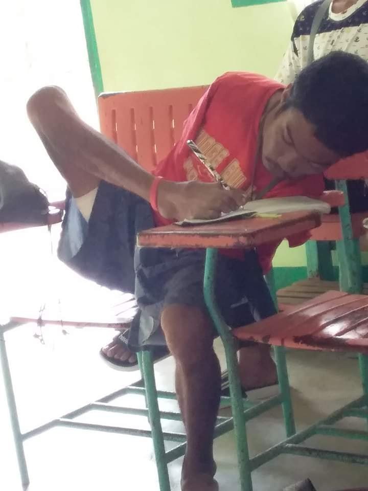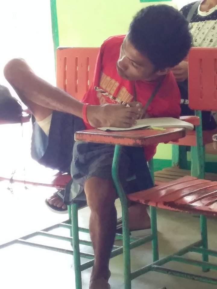 In the photos, Ferdinand could be seen using his foot to write on his notebook. He didn’t even have a modified table; though he uses two armchairs as he sits on one while using the second one’s table. Still, it was amazing that he was able to write with his foot.