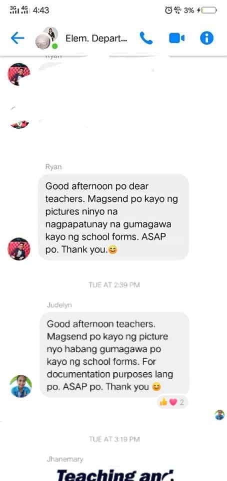 “Good afternoon po, dear teachers. Mag-send po kayo ng pictures ninyo na nagpapatunay na gumagawa kayo ng school forms. ASAP po. Thank you,” read a message in the teachers’ group chat.
