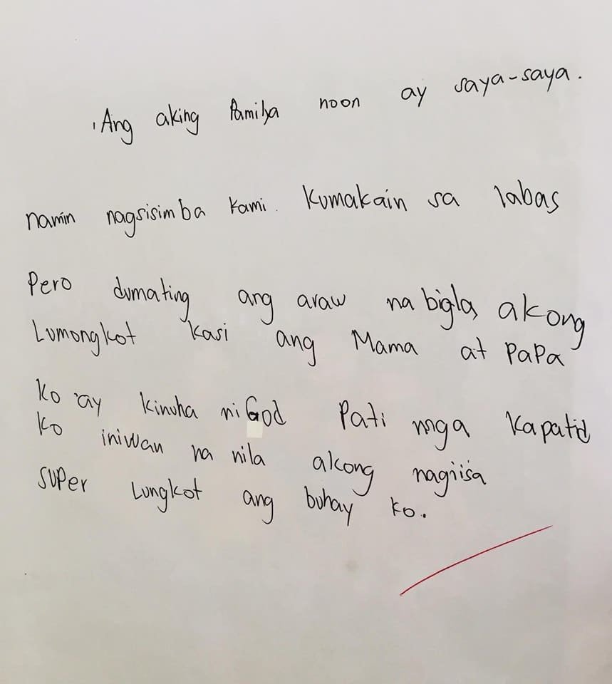 Rheann told his teacher that he lost his family to a fire just this year, on March 12. According to him, his parents and younger siblings were sleeping when their house in Isabela caught fire.