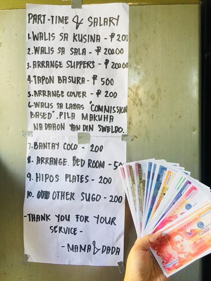 For example, sweeping the kitchen earns them Php200. They get another Php200 after sweeping the sala. Arranging the bedroom earns them Php500 while pay for sweeping outside the house is based on ‘commission’ – their earnings are based on how many leaves they were able to sweep.