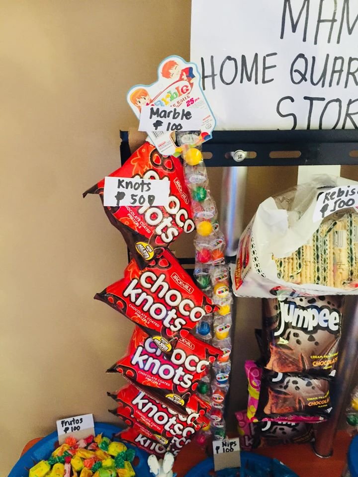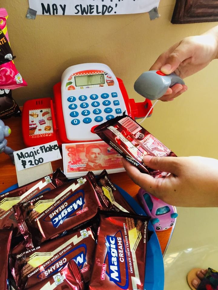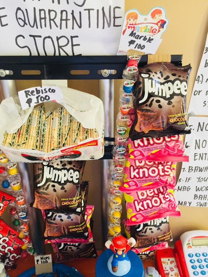 At “Mama’s Home Quarantine Store”, the kids pay Php500 for choco knots or for a pack of biscuit and Php100 for a piece of candy or wafer stick! But mommy Hycinth explained that the store is ‘overpricing’ because they only had paper play money, no coins. So, they simply adjusted the price to reflect the money they had available.
