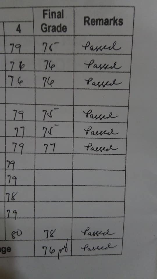 Saka di ko naman pinangarap na magsabit ng medal sa stage bili na lang tayo sa recto at wala rin naman akong ipapamanang talino sayo. Pag igihan na lang natin next year baka sakali maka 79% na tayo. Saka yung 76% di biro yan ha lagpas pa rin yun sa passing na 75% yun kung baga may allowance pa..