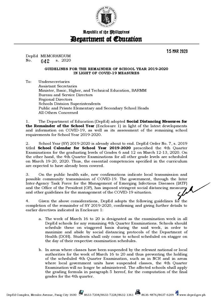 For schools who still hold classes, DepEd tells teachers to do the exams on a “staggered basis”. This means that the students should not come to school at the same time. Instead, they should take the tests in varying schedules and the schools should implement the social distancing protocol to prevent the spread of COVID-19.