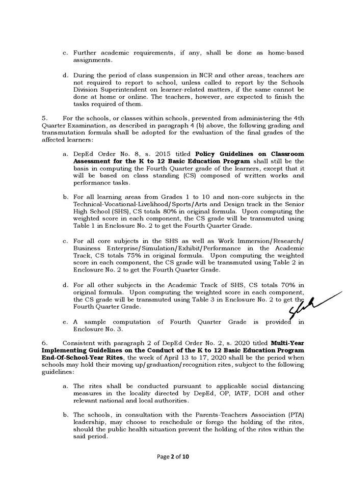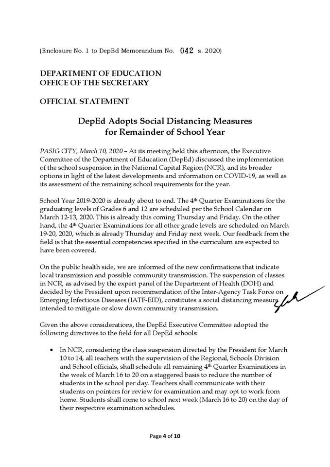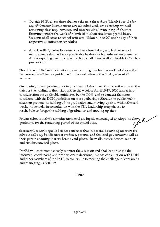 Considering that public schools were supposed to administer the fourth quarter from March 16 to 20 and the school year is supposed to end on April 3, based on the DepEd’s academic calendar for school year 2019-2020, Education Secretary Leonor Briones declared no more final exams in these affected areas.