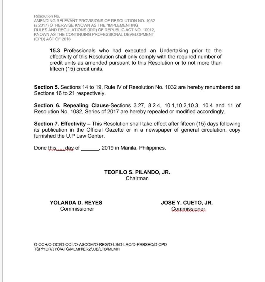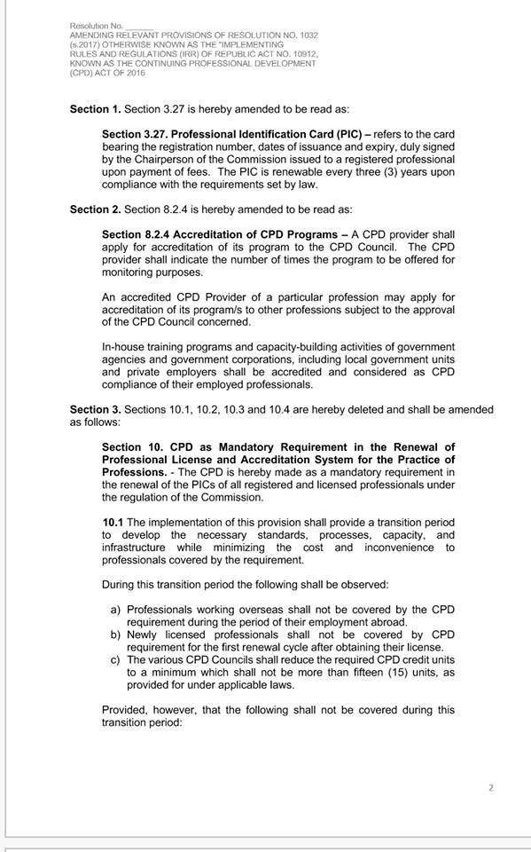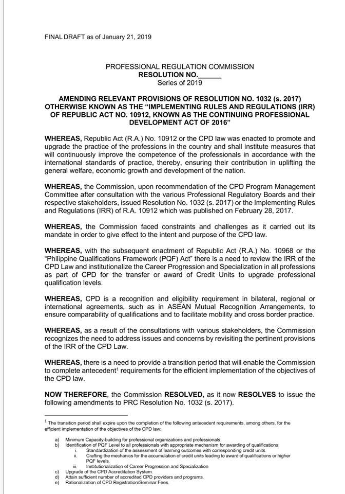 Until the new IRR is released, newly licensed professionals and OFWs are exempted from complying with the CPD requirements, under the transition period. Meanwhile, all councils were directed to reduce the requirement to just 15 CPD units.