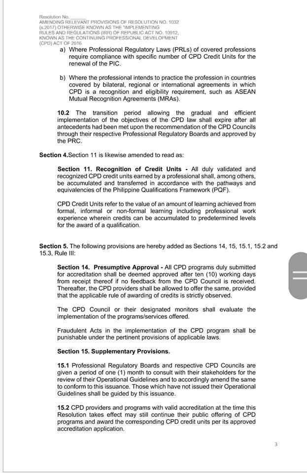 - More good news awaits professionals after it was announced that “until the PRC complies with certain pre-conditions, all seminars attended by licensed professionals should be recognized as CPD units and shall be accepted as valid for the renewal of their licenses.”