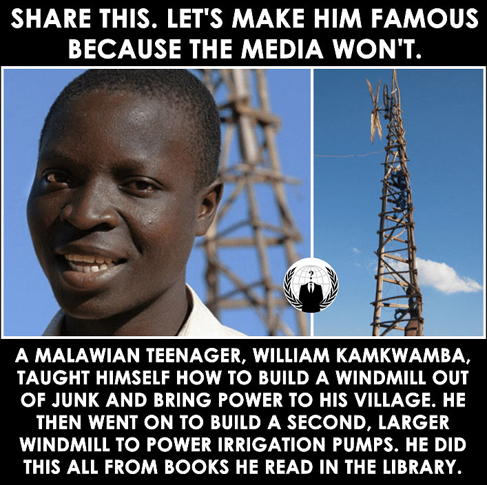 Living in a poor village in Malawi, William Kamkwamba knew that something must be done to help improve the life in his village. So, at age 14, he taught himself how to build a windmill from junk just by reading books! Can you believe that?
