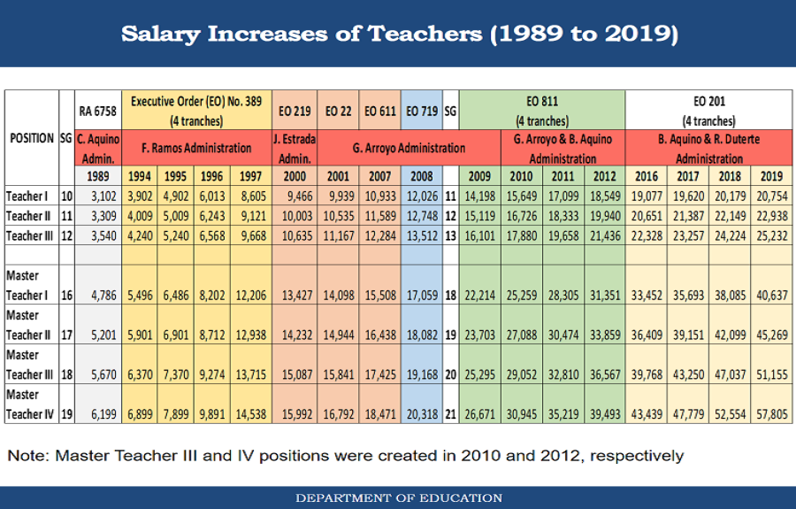 Unknown to most members of the general public, most of the public school teachers have the positions of Teacher I to III with Salary Grades of 11 to 13. This means that they are receiving a basic monthly salary of Php20,754 for Teacher I, Php22,938 for Teacher II, or Php25,232 for Teacher III.