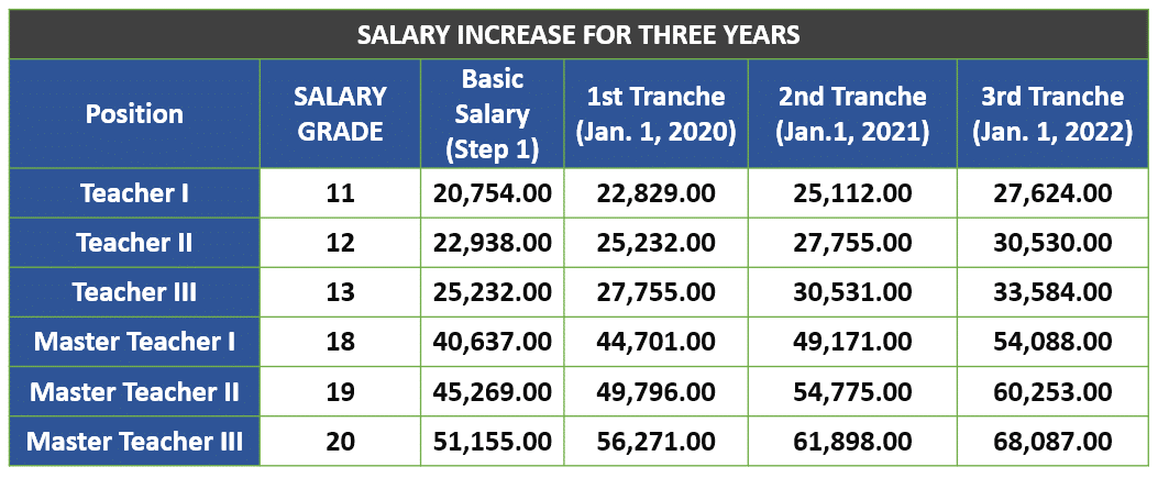 This bill mandates a three-year salary increase for government officials and employees at 10% of basic salary per year. The first tranche of the salary adjustment shall be implemented on January 1, 2020, and every January 1 thereafter until the final tranche in 2022.