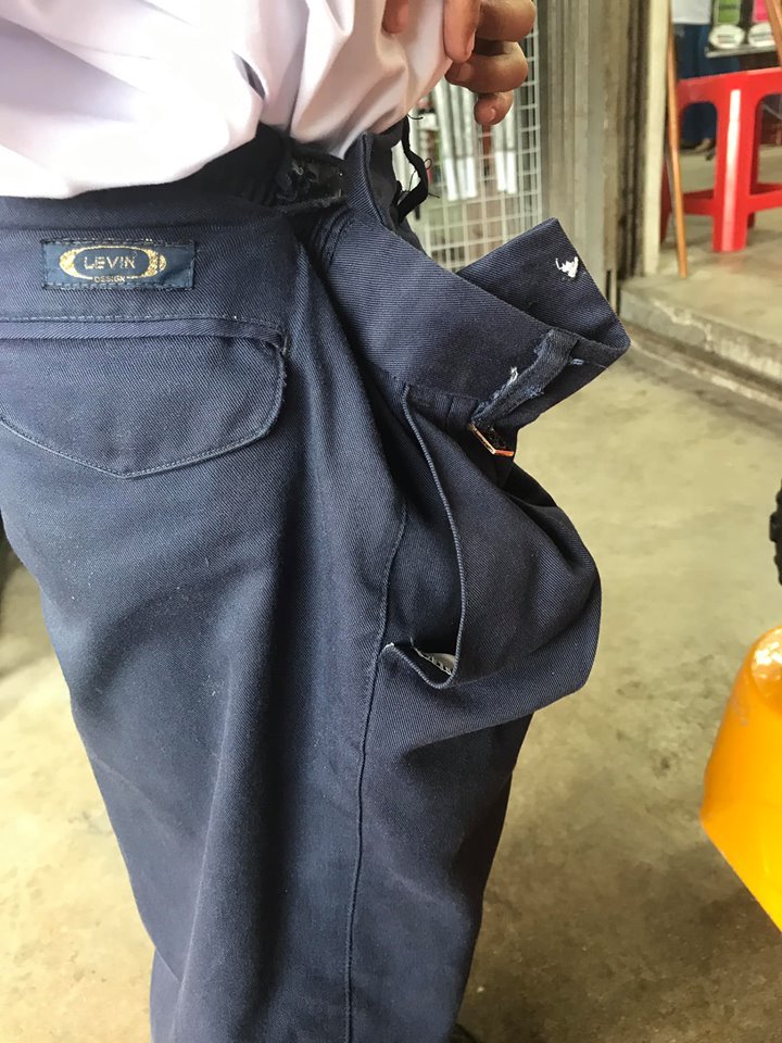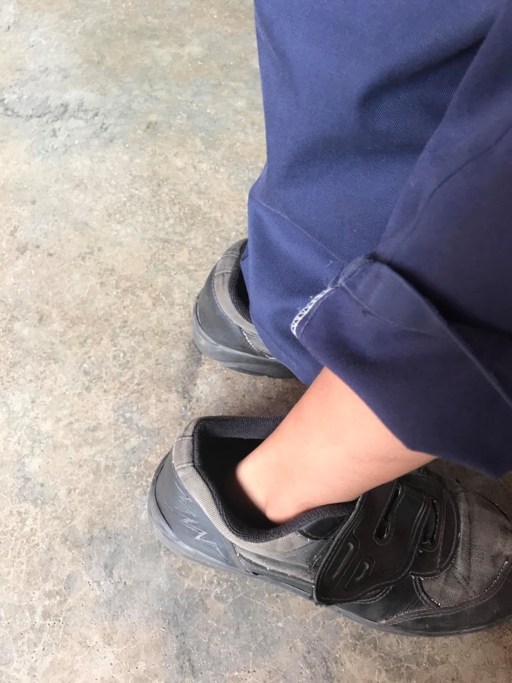 One day, he noticed a Grade 3 student struggling across the school yard, dragging his feet as he walked. Curious, the teacher observed the student and noticed that his hand was holding his pants in place, knowing the baggy old uniform could fall to his feet if he didn’t do it.