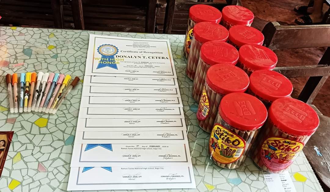 He shared photos of his treats for the students: one pack of chocolate wafer sticks and some colored ballpens with cute designs. They also held a simple recognition program where the parents of the honor students were invited.