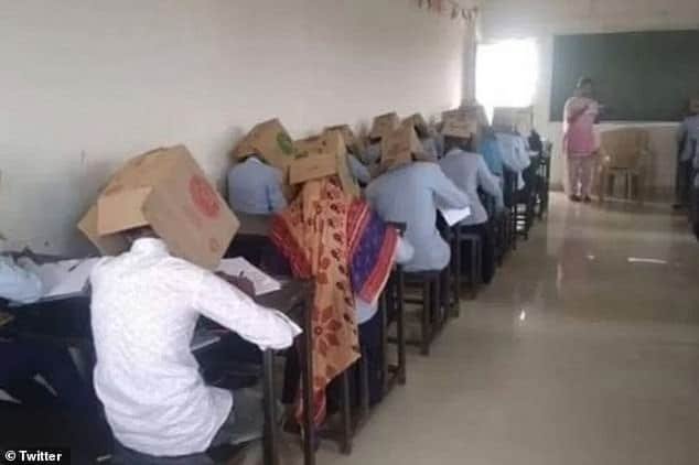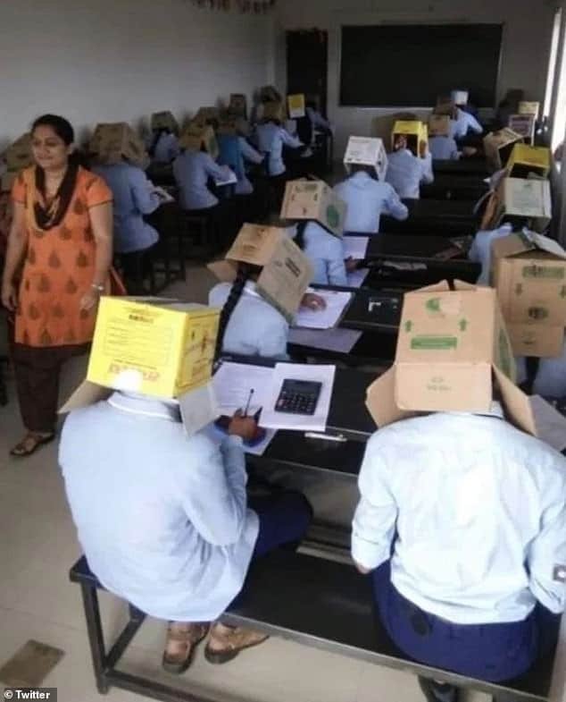 Recently, a teacher at an Indian school went viral for the smug smile she had as she watched her students wearing boxes on their heads to prevent them from cheating. The photo was identified to be taken in one of the classrooms of Bhagat Pre-University College in Haveri, Karnataka state.