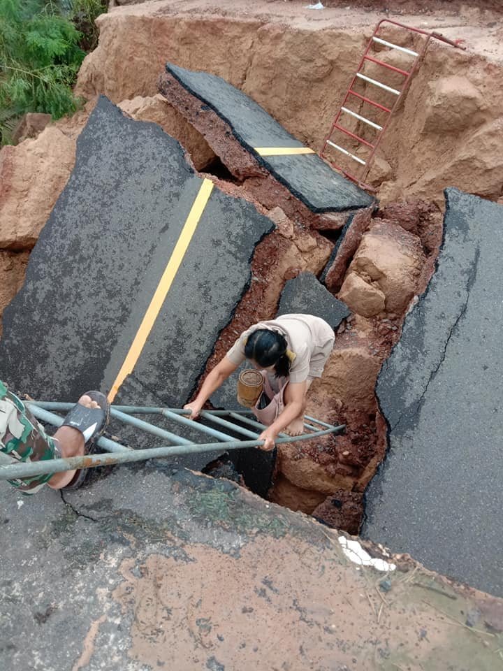 After reaching the ground, she still has to walk over the broken ground to reach the other side where another makeshift ladder was waiting. It was difficult and quite risky because the ground could move further, yet this teacher and the other commuters have no other choice.